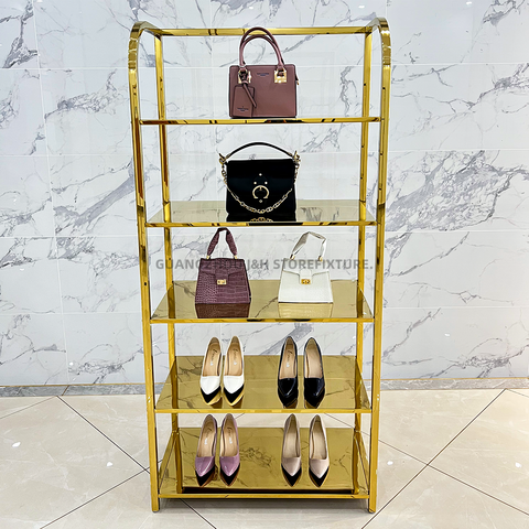Présentoir de sacs en métal doré personnalisé meubles chaussures sac à main présentoir personnalisé pour centre commercial magasin de vêtements présentoir étagère