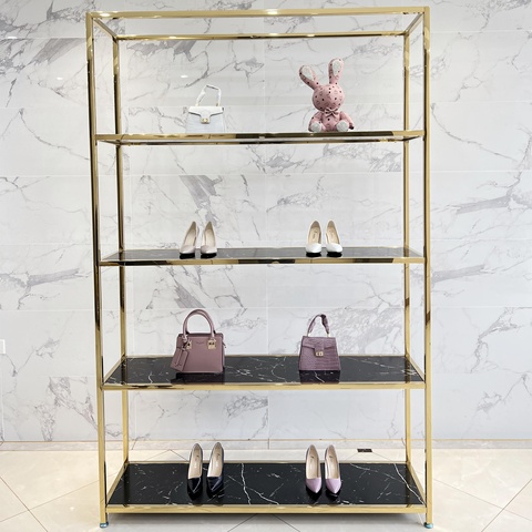 Présentoir de sac à main de luxe, présentoir de meubles, de chaussures en or, présentoir d'étagère pour magasin de vêtements de détail