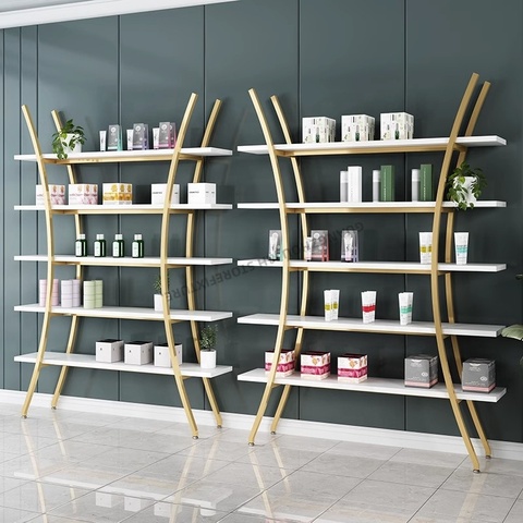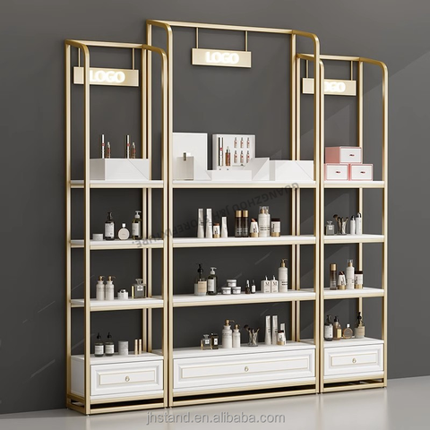 Schoonheidssalon Producten Display Kast Vloer Staande Gouden Display Stand Voor Cosmetica Winkel Led Cosmetica Display Rack